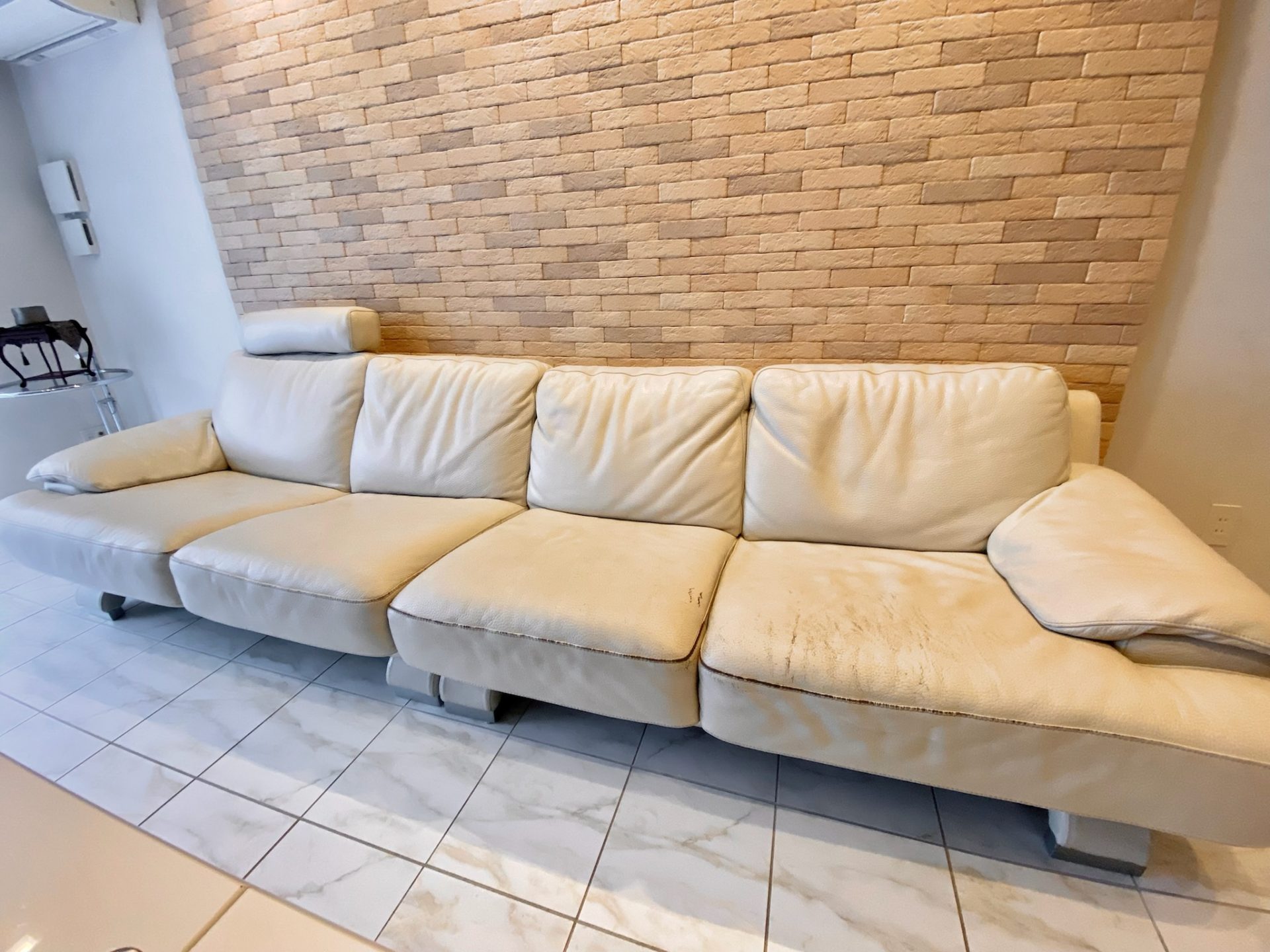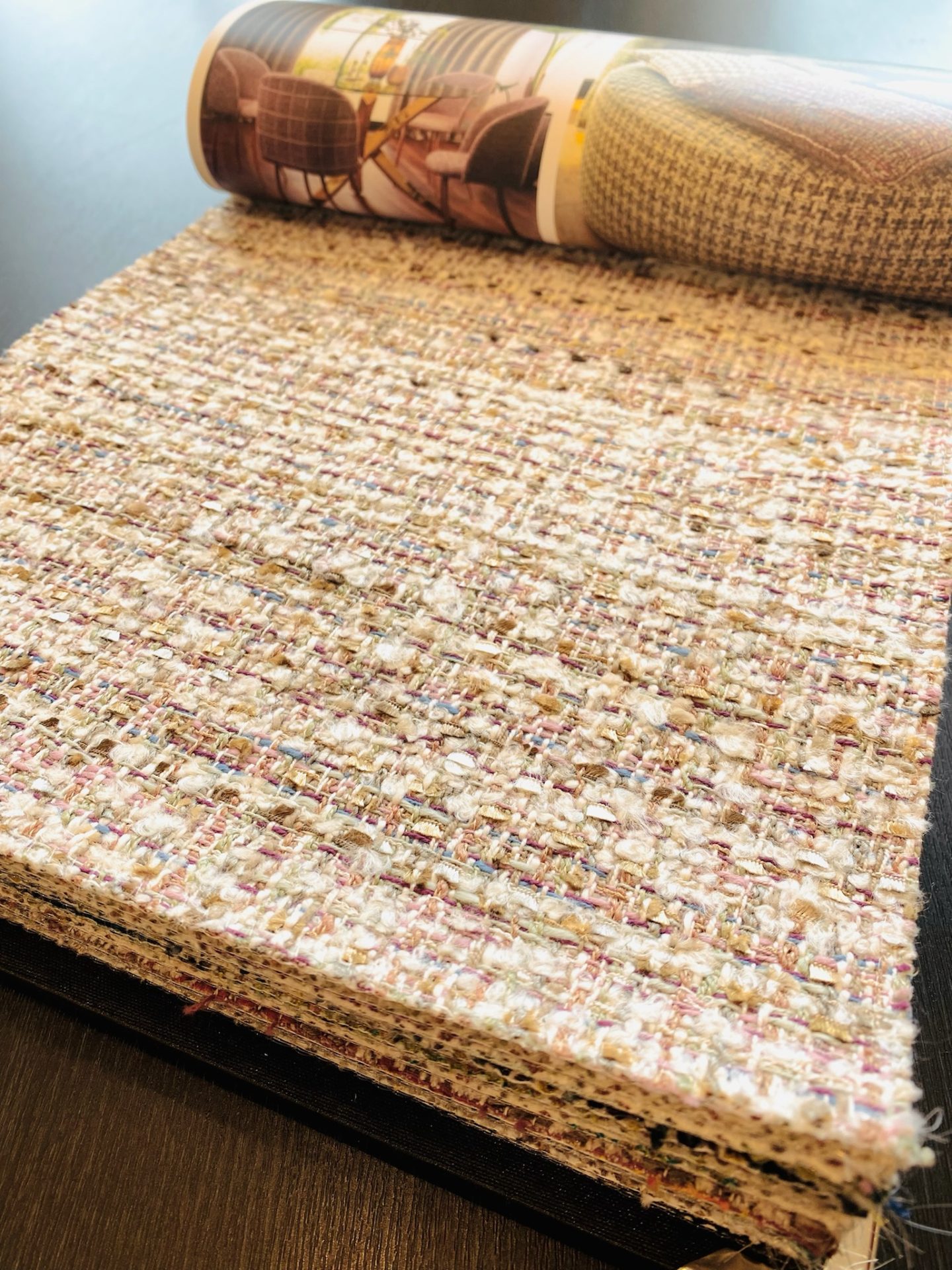 ココシャネルのツイード生地のようなおしゃれな生地を使って、ソファーカバーを作らせていただきました。