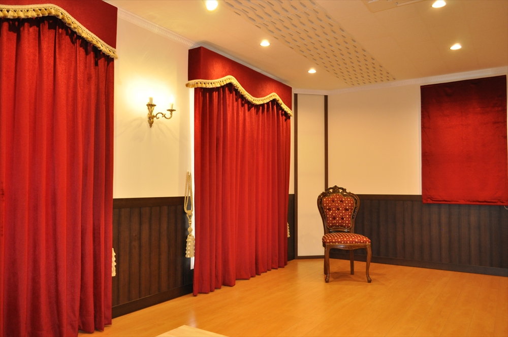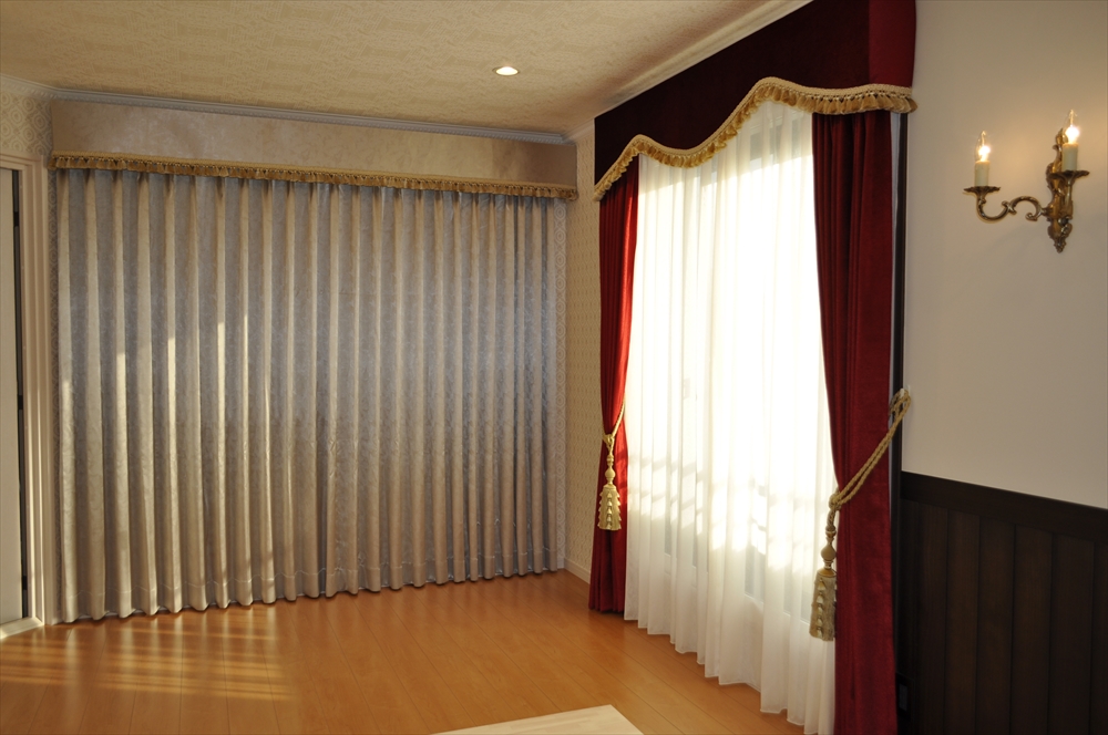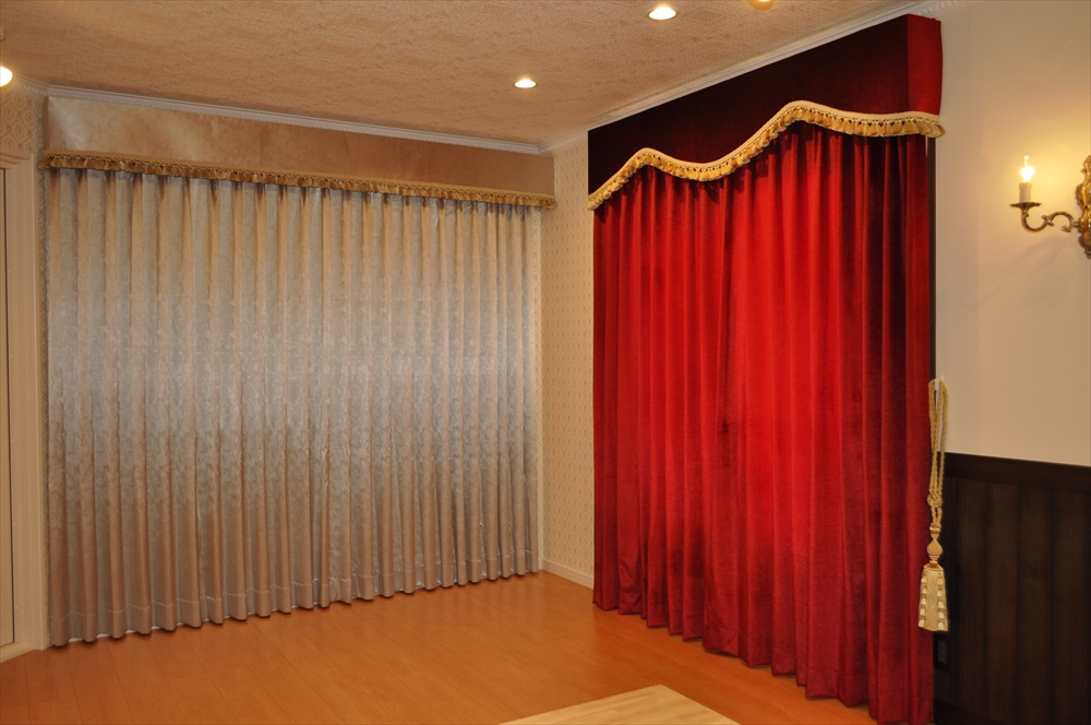 ■施工ポイント:カッパーレッドのベルベット生地を、同生地のボンディングバランスと合わせて施工させて頂きました。深みのあるレッドはヨーロッパならではの特別なカラーです。重厚感のある生地と豪華なトリム付のバランスで格調高い仕上がりになりました。光を遮りたい窓には遮光の生地で日光をカットしました。美しい光沢がある遮光の生地は、海外ならではの商品です。美しさと機能性を兼ね揃えた優雅な空間となりました。