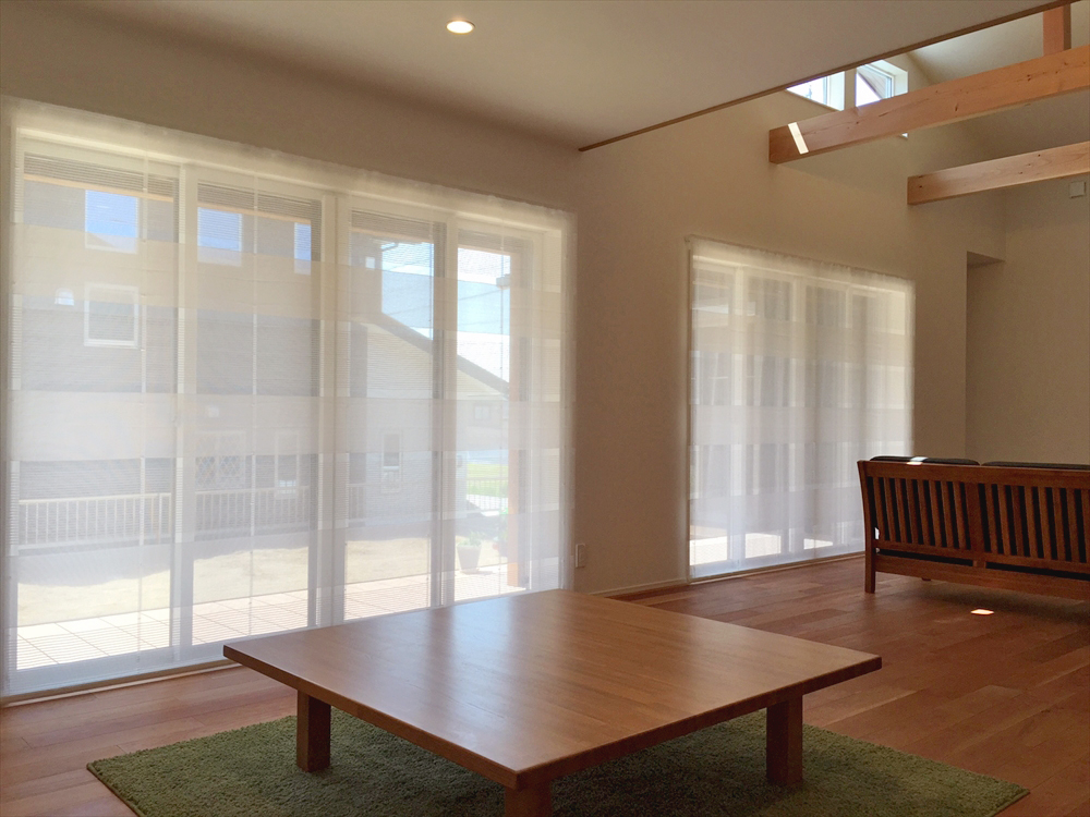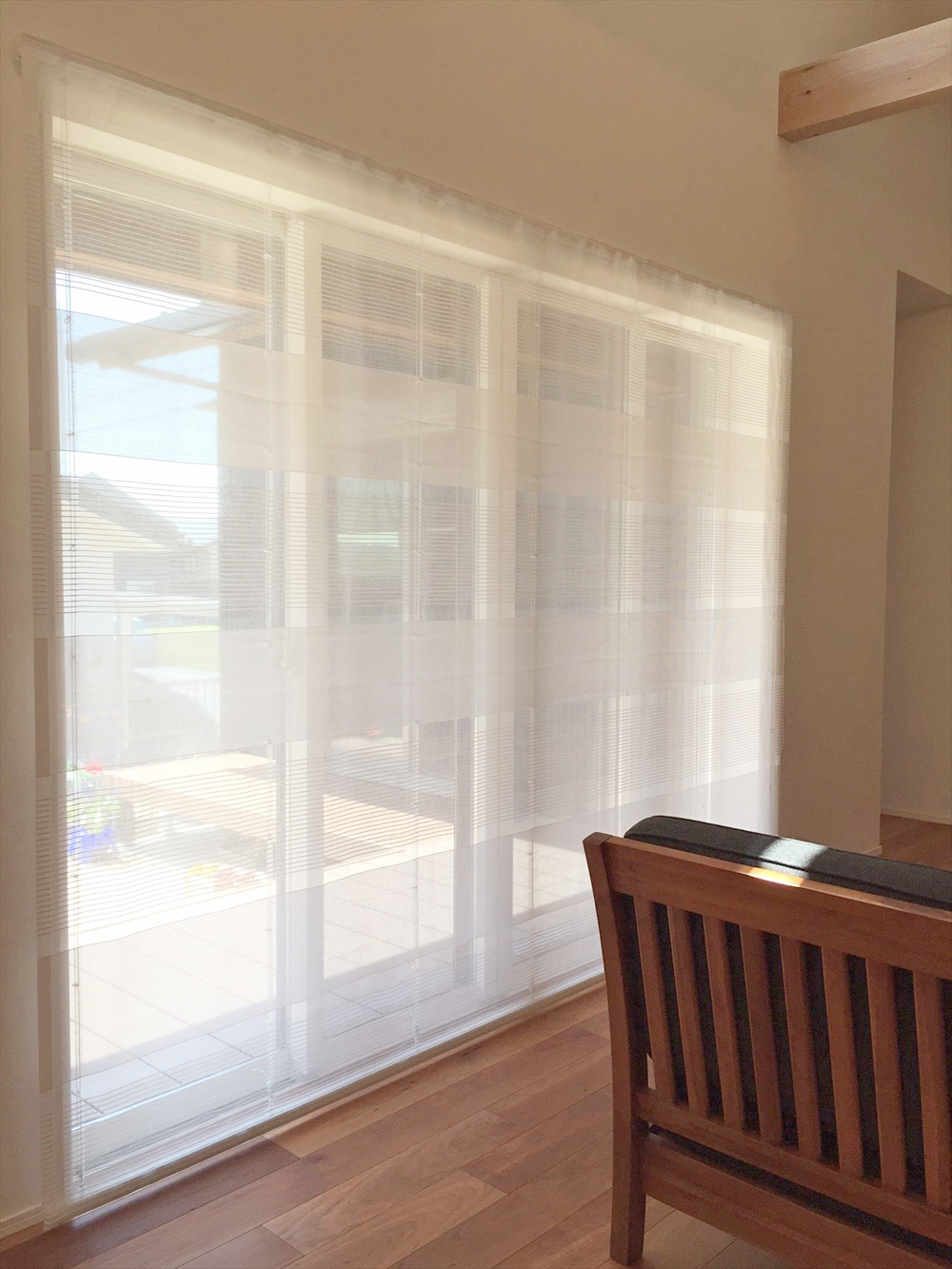 ■施工ポイント:床材や梁、家具等をミディアムカラーのナチュラルウッドで統一しているリビングに合わせた大きなボーダー柄のレースは、シンプルなホワイトカラーなので空間の邪魔をすることなくしっくりと馴染み、とても落ち着きのあるリビングになっています。広幅の窓にボーダー柄を合わせることによって空間に広がりを見せてくれています。