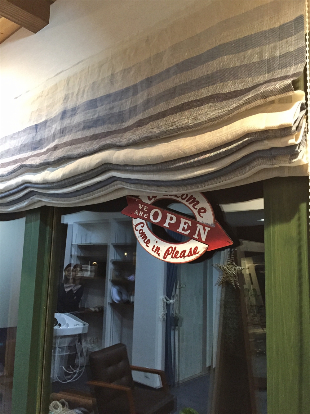 ■施工ポイント:波乗りが好きなご夫婦の経営するヘアサロンのカーテンを施工させて頂きました。メインにはボーダー柄のリネンレースをシェードスタイルで。生地を持ち上げたときの裾のゆるいウェーブが、まるで波の様に見えてイメージばっちりとの嬉しいお言葉を頂きました。こちらはレースですがしっかりとしているので程よく透ける、くらいの生地感となっており、お店などの窓にも適した生地です。外からみても柄が良く分かます。通りがかりにブルーリネンのグラデーションにときめく方も増えそうですね。