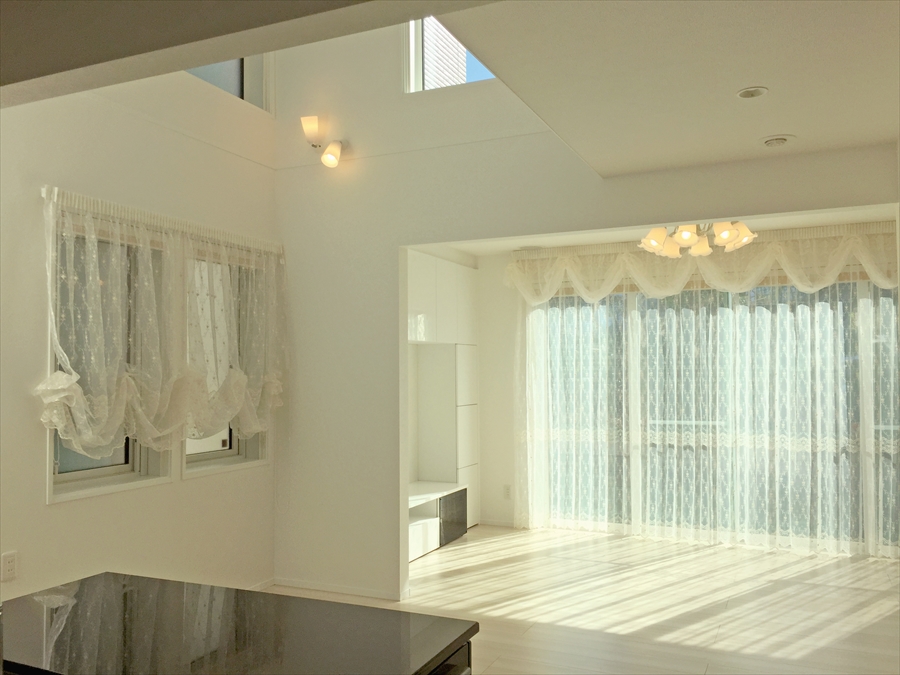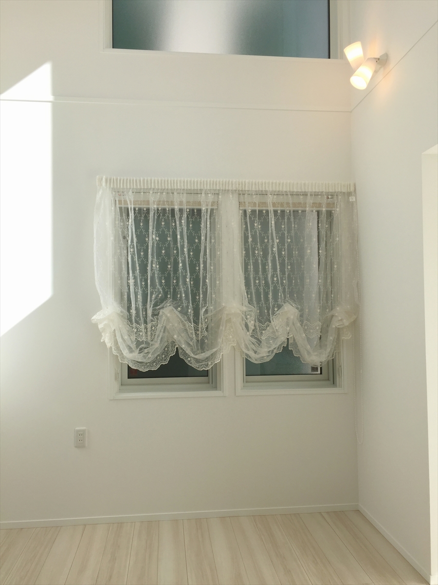 ■施工ポイント:トルコ製のレースはオーロラピンクの小花刺繍が施された繊細な生地です。腰窓はギャザーのバルーンシェードで可愛らしくエレガントに。大きな掃出し窓にはバルーンスタイルをスワッグバランス風に仕上げました。ホワイトの内装にレースのボリューム感がバランスよく、ワンランク上の窓辺となりました。