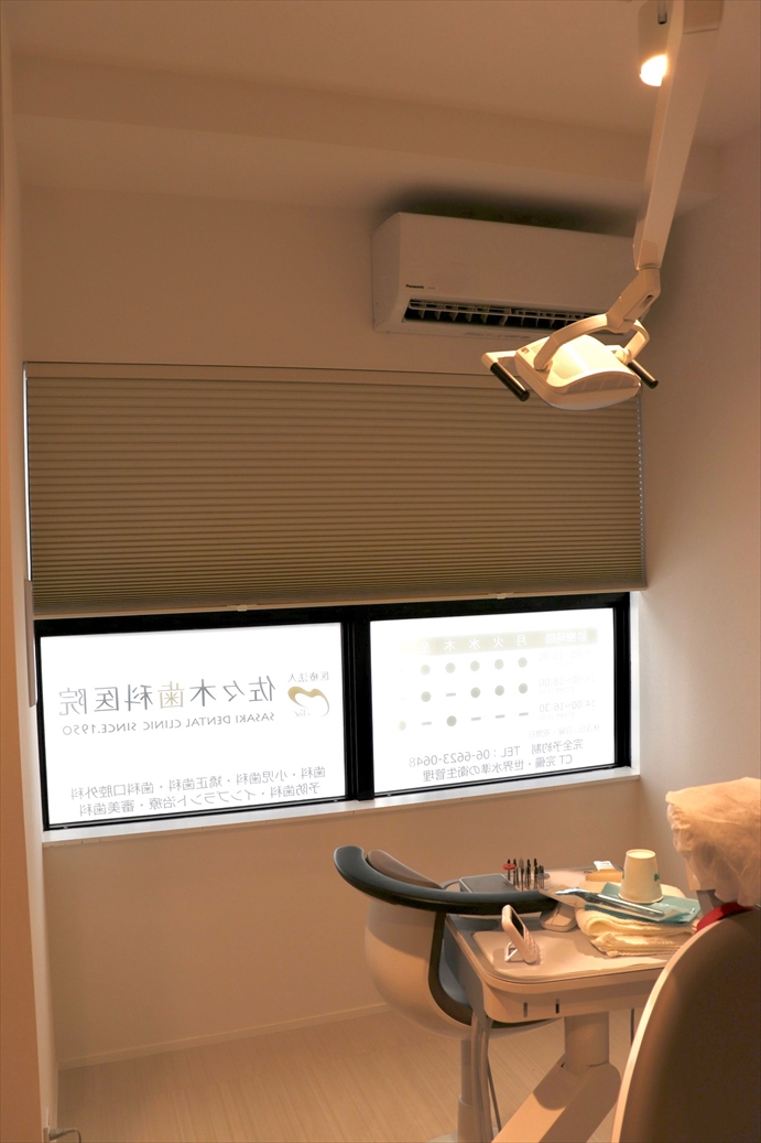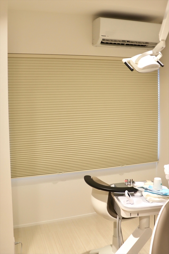 一度電動を味わったら誰もが欲しくなる、そんなワンランク上のスクリーンです。治療室には遮光の生地を施工させて頂きました。