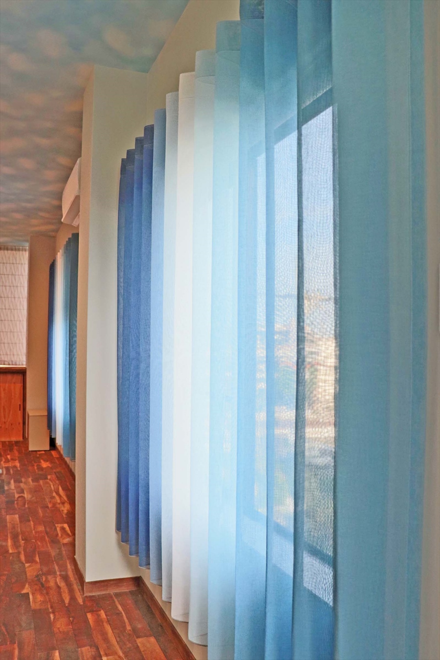 ■施工ポイント:某オープンスペースにヨーロッパで人気の「ニューウェーブ」仕立てのレースカーテンをメインに施工させて頂きました。生地は天井の空に合わせたイタリア製のグラデーションブルー。濃い色から始まりだんだん白くなって、また淡いブルーへと移りゆくデザインは斬新で見る者を魅了します。またそのデザインを最大限に引き出す仕立て方「ニューウェーブ」は、きれいなウェーブを作り出し立体感が増してとても美しかったです。それを支えるドイツ製のレールは、シンプルでありつつ洗練されたアートのようにワンランク上の空間を演出してくれます。