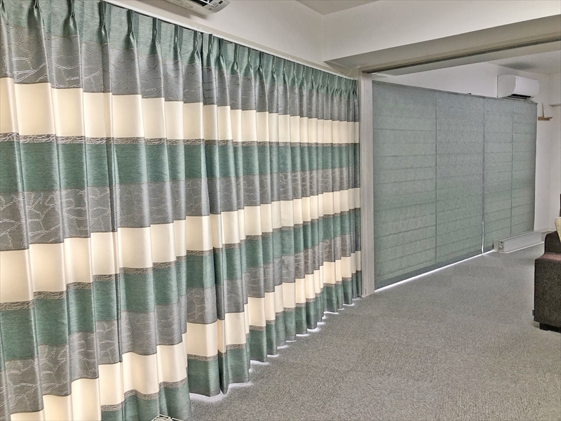 ■使用生地:電動カーテン/6473 DANILOミストブルー(ドイツ)、電動シェード/8548ジェームス ミストグリーン(ドイツ)