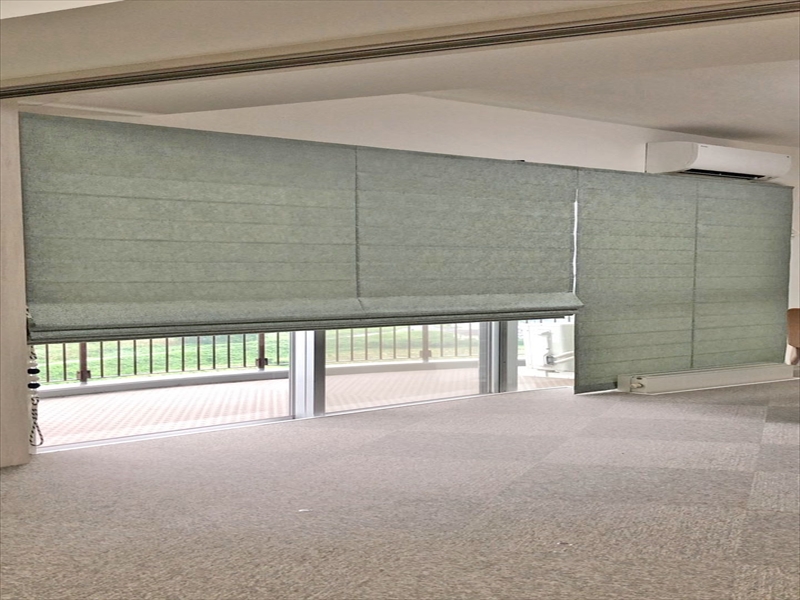 ■施工ポイント:広々としたリビングの窓に映えるグリーンの電動カーテンとシェードを取付けさせて頂きました。カーテンは個性的ながら落ち着いた色合いで、部分的に入った模様が海外ならではのおしゃれなデザインです。シェードはさらにシックな色合いのグリーンを選ばれました。シャープシェードにすることできれいにたたみ上がり、よりスタイリッシュに見えます。電動なのでカーテンに触れることなくリモコンひとつで開閉できるので介護が必要な方にも最適です。