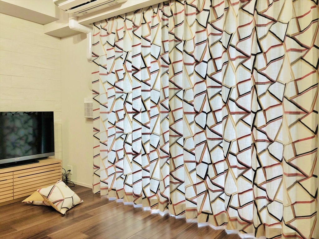 個性的なのに派手すぎないこのドレープ生地はTetrisという名前。どこか懐かしい配色で、なおかつ現代的な柄域の他にはない一窓に仕上がりました。