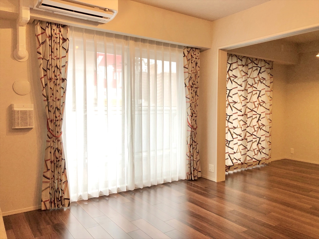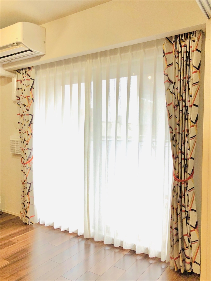 ■施工ポイント:駅前の好立地なマンションをご購入のお施主様に、窓からの視線や景色を隠せるレースと、個性的な魅力のカーテンのご提案です。奥様が在宅ワークがメインとの事で、とにかくお昼間に明るく楽しく心地よく感じるドレープ生地をお探しでした。暖色をメインした刺繍柄で3点ほどの候補の中から、ナチュラルな綿ベースに絶妙な配色の刺繍模様がおしゃれなイギリス製の1枚をお選び頂きました。