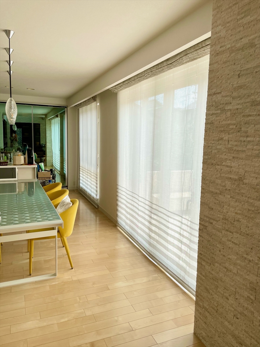 ■施工ポイント:嬉しいリピーター様の施工例です。お部屋をモダンな雰囲気にされたいとのご要望で、吹抜けのある開放的なリビングダイニングの大空間に、モダンでラスティックなシャンパンアイボリーの厚地と裾にだけライトグレーのボーダーラインがあるレースでダブルシェードスタイルにしました。大きな面積を占める窓まわりは柄が主張しすぎることのない無地調の生地でコーディネート。質感とさりげない光沢感で上質な空間を演出しました。