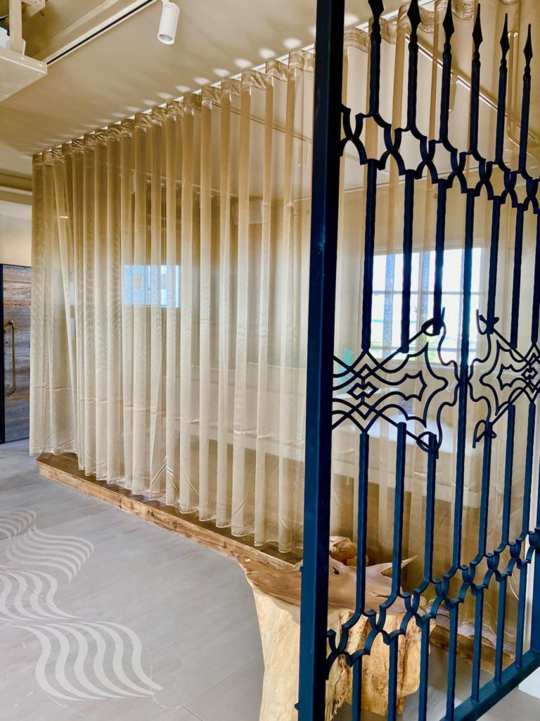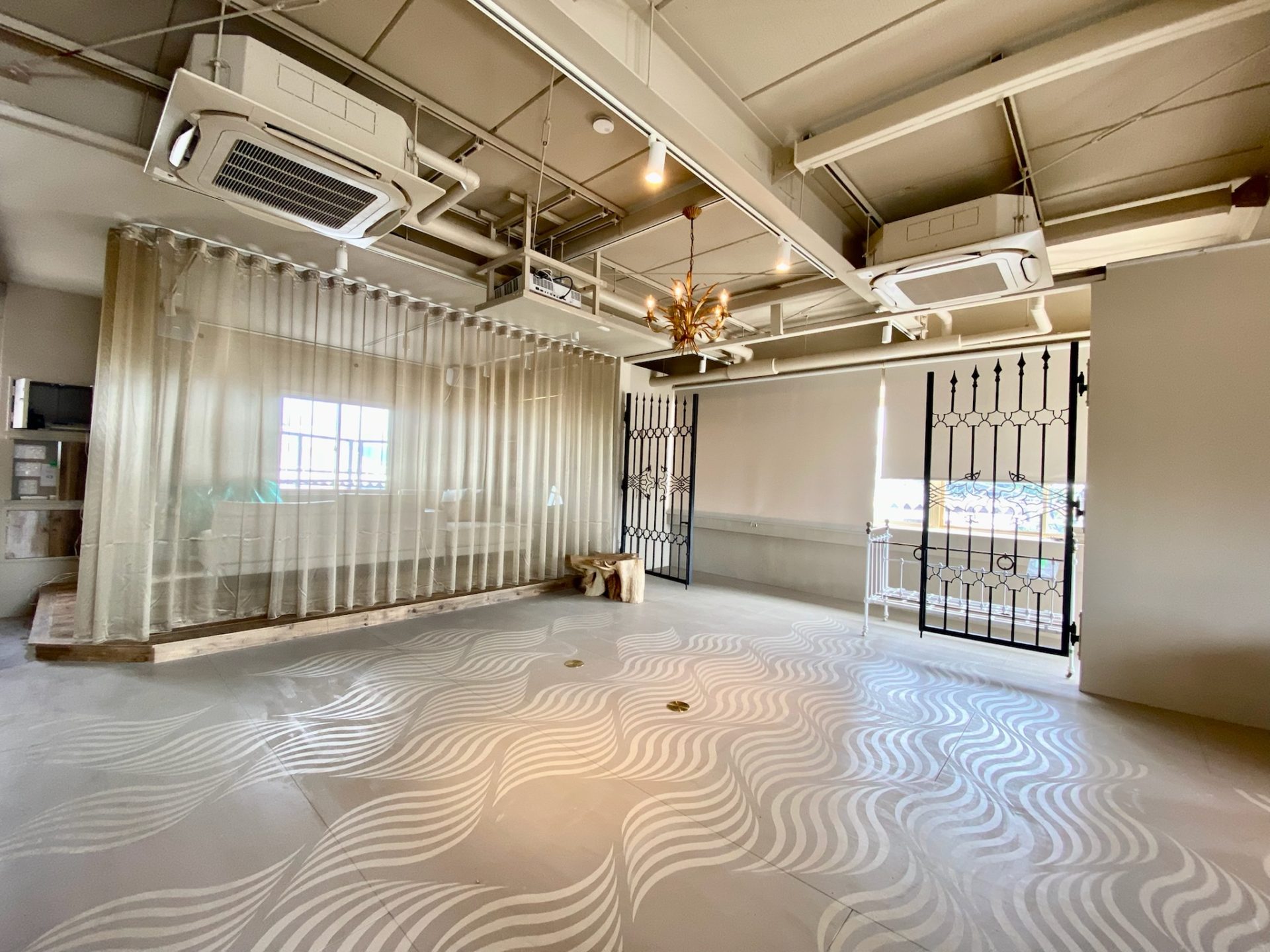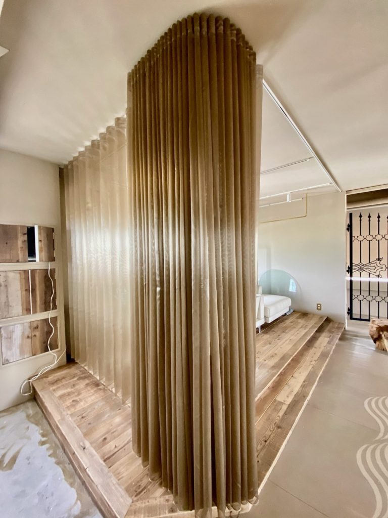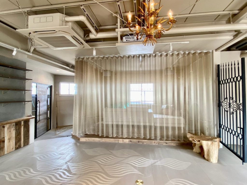 芸術センスあふれるお客様との空間づくりはとても楽しいひとときでした。何もないところからイメージして形にするのは決して簡単なことではありませんが、お母様と娘さんの絶え間ぬ努力で仕上げられた作品を拝見するとカーテンでこける訳にはいかず、、、生地、色、スタイルレール選びから縫製、取り付けに至るまでちょっと苦戦しつつも皆の気転と幸運に恵まれた現場となりました。こちらの店舗ですが結婚式やイベントでレンタルされる可能性もあるようです。とても長いお付き合いのH様ご一家素敵な方です。また是非問い合わせ頂ければと存じます。