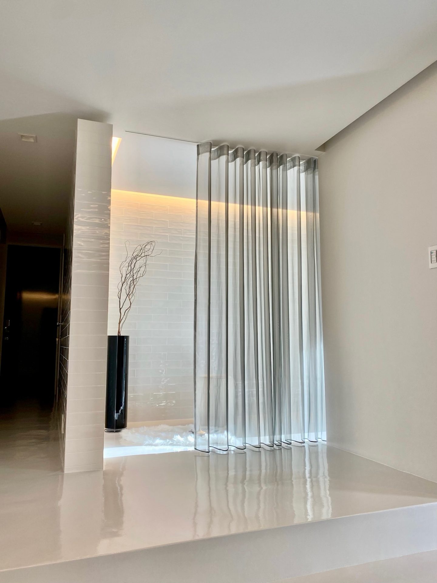 空間にレースカーテンを付けるだけで「奥に何があるのだろう?」という魅惑がうまれます。視線を遮るというより空間を引き立てるカーテンの使い方です。埋め込みのカーテンレールにグレーのカラーレースを使い、ウェーブ加工で仕立てました。シンプルでありながら洗練されたモダンさが魅力的です。