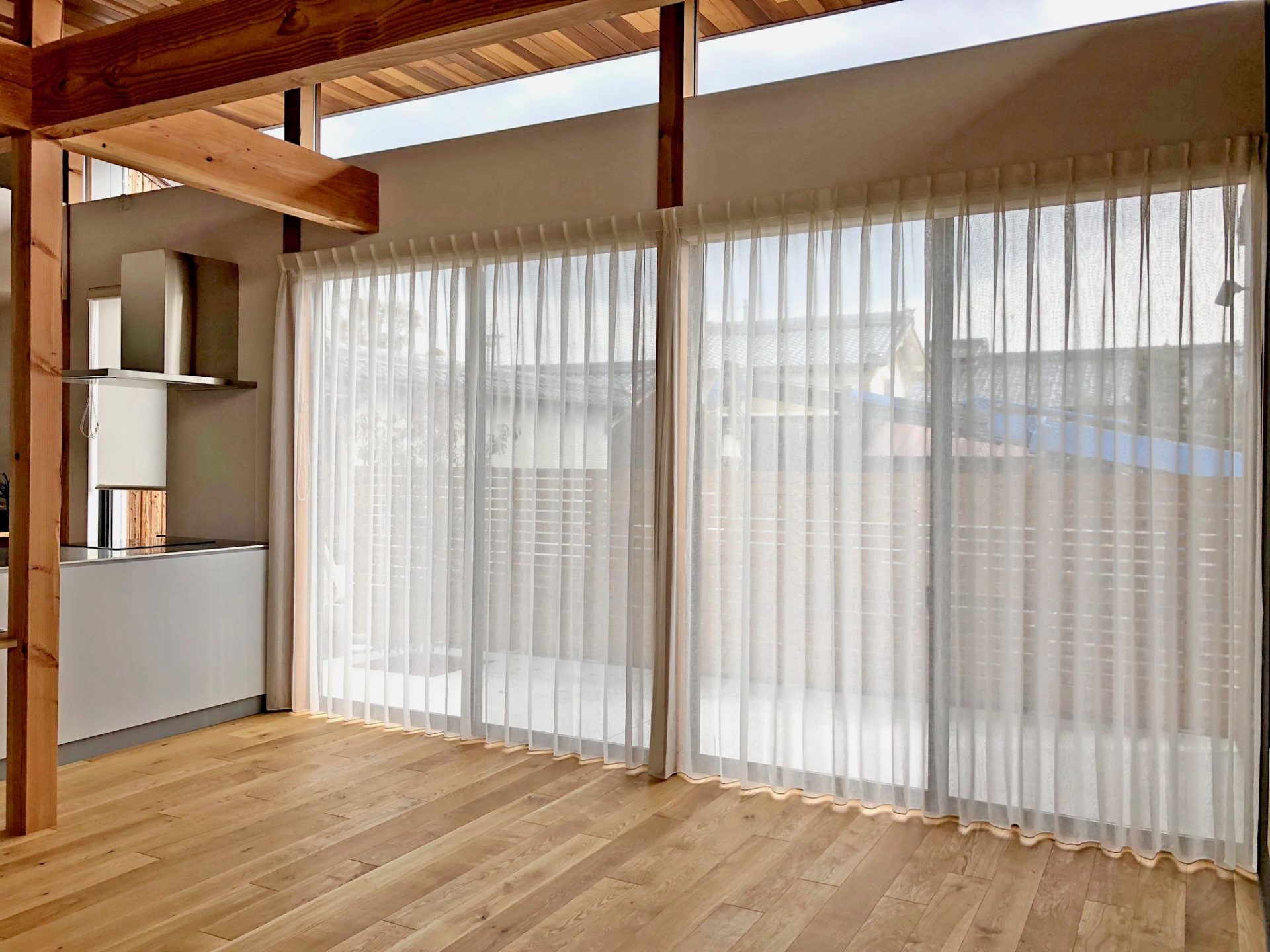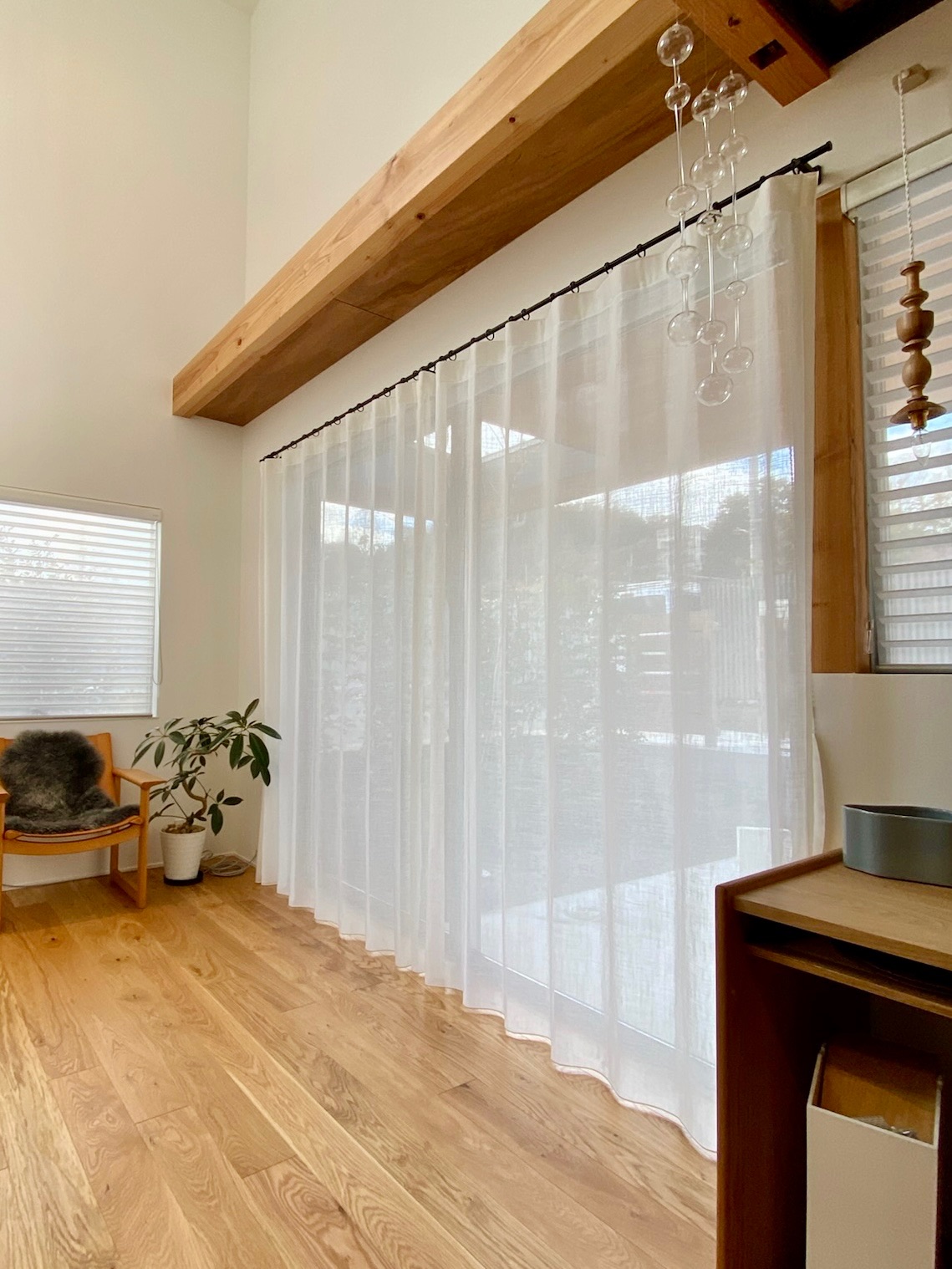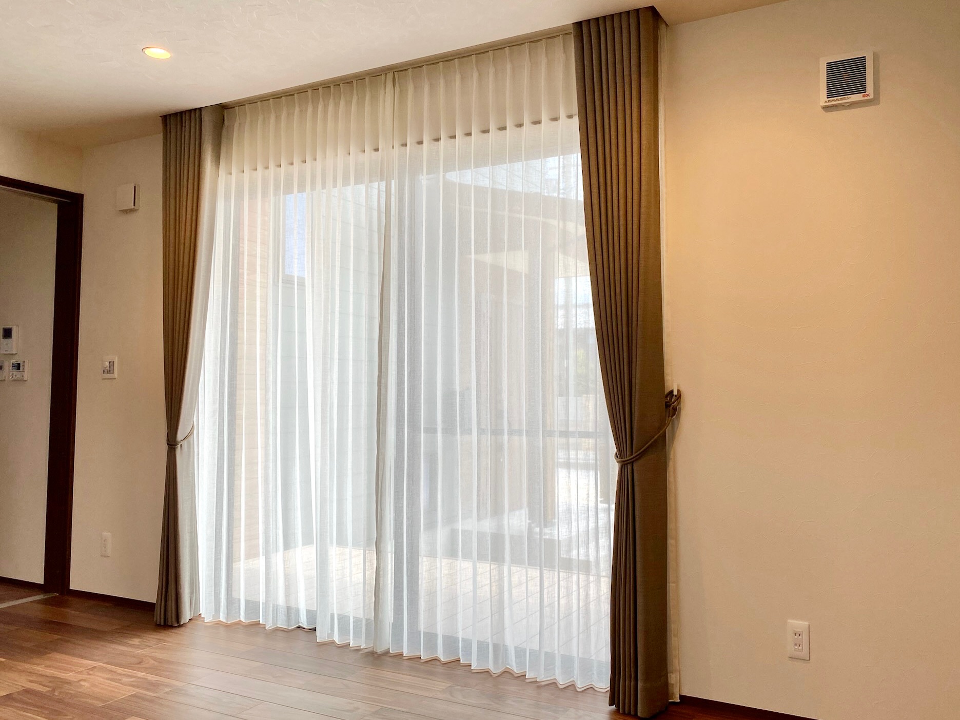 掃き出し窓の外にはここから外構工事で目隠しができる予定です。軒も深く、視線も少ないので、厚めのレース1枚でシンプルに仕上げました。昼間はサイドに寄せてオープン。ポリ&リネンの安定した質感で束にしてもシワシワになりすぎません。