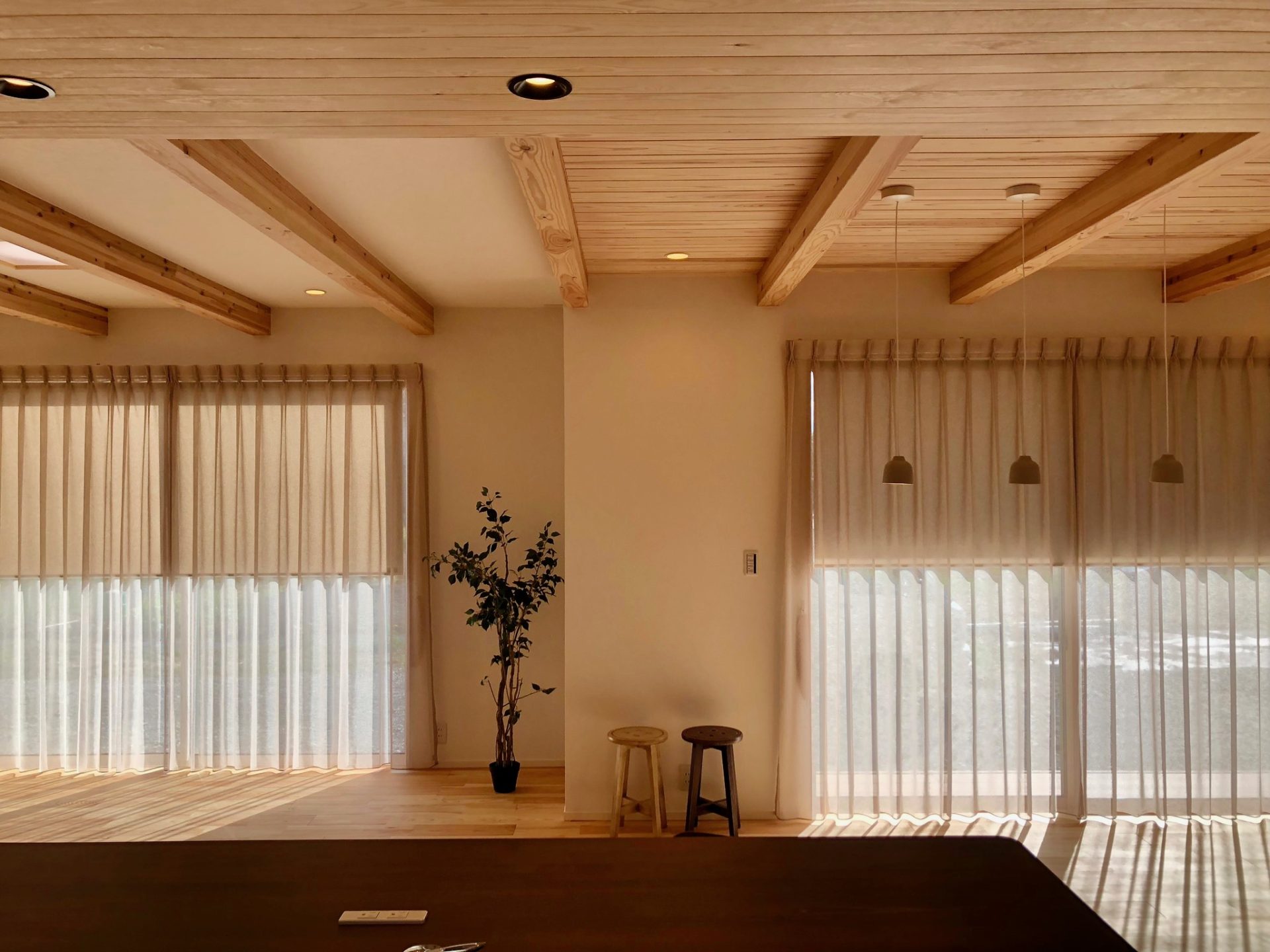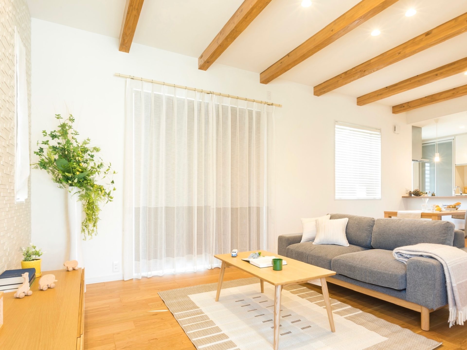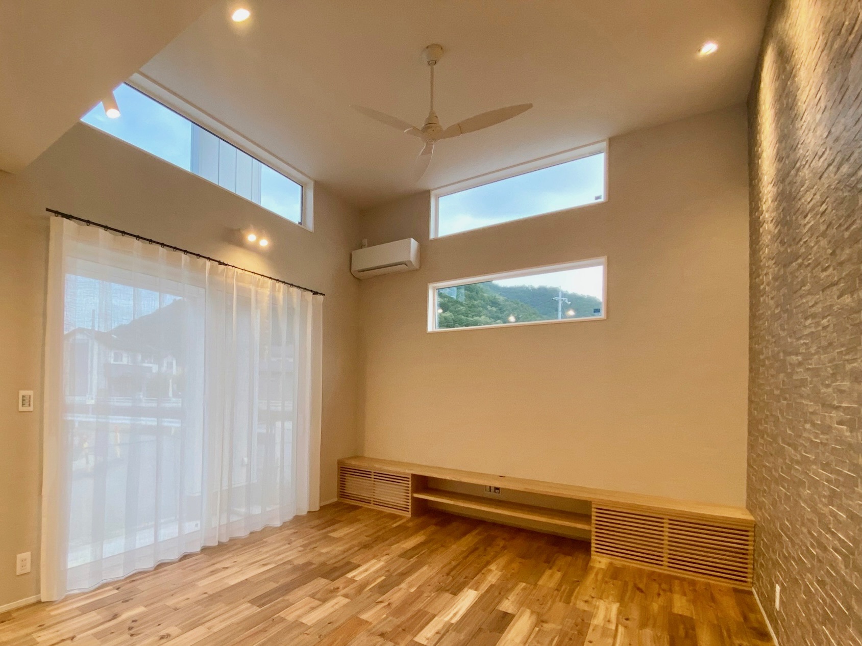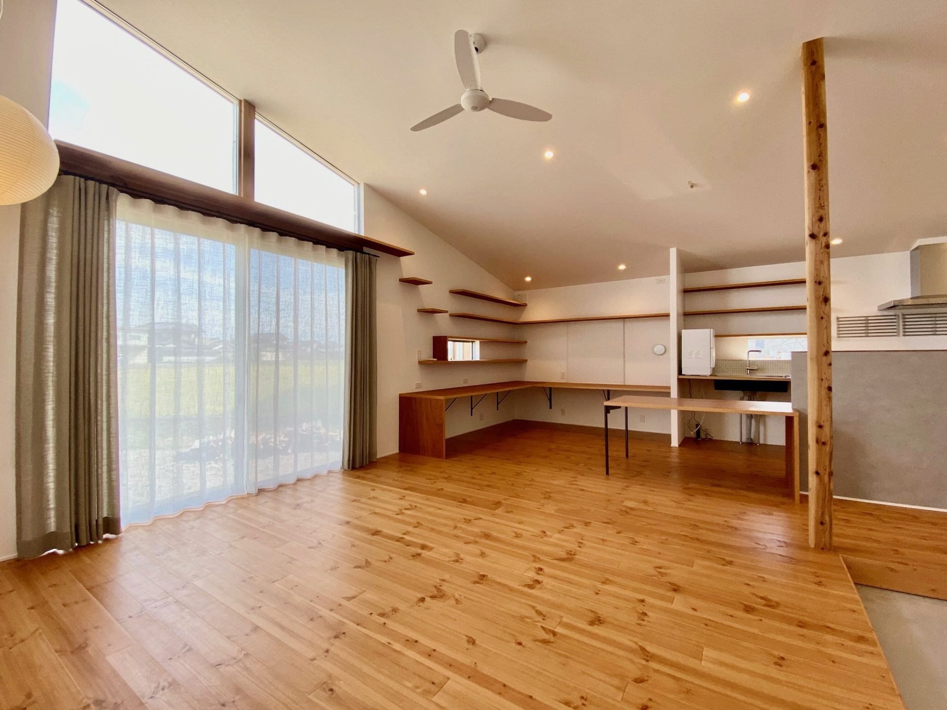 掃き出し窓の外にはここから外構工事で目隠しができる予定です。軒も深く、視線も少ないので、厚めのレース1枚でシンプルに仕上げました。昼間はサイドに寄せてオープン。ポリ&リネンの安定した質感で束にしてもシワシワになりすぎません。