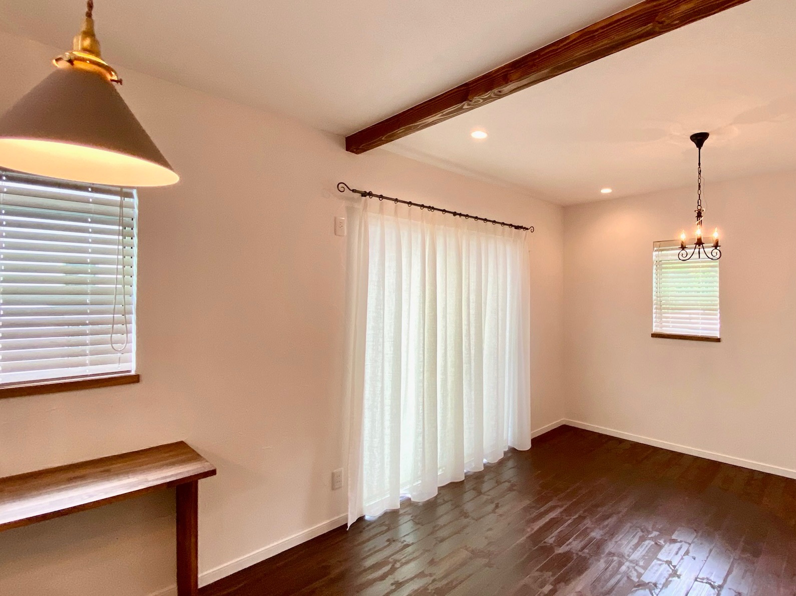 掃き出し窓には照明器具とコーディネートしたアイアンレールにオフホワイトのリネン(レース)でナチュラルフレンチな窓まわりを演出しました。リネンならではのシャリ感にシワ加工が施されたモンルーベおすすめのレースです。レースの柔らかな印象と木製ブラインドのすっきりとした印象が融合された窓装飾です。