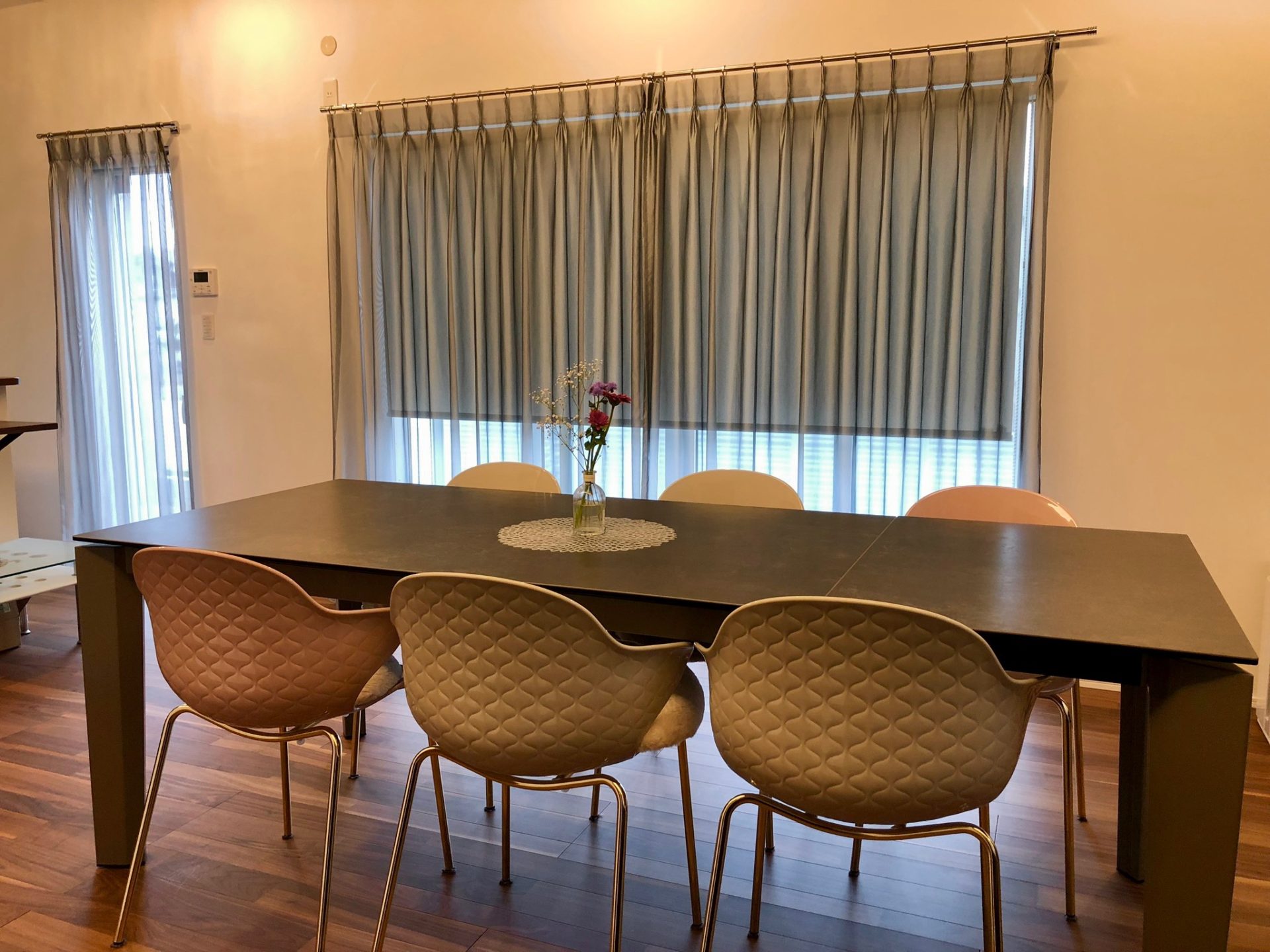 シンプルモダンなお部屋には、シルバーのアイアンレールに、グレーのセミオーガンジーレースを合わせました。ロールスクリーンも同色にし、よりモダンな印象を。ホワイトとピンクのダイニングチェアに合わせたカラーレースで、ハイセンスに。
