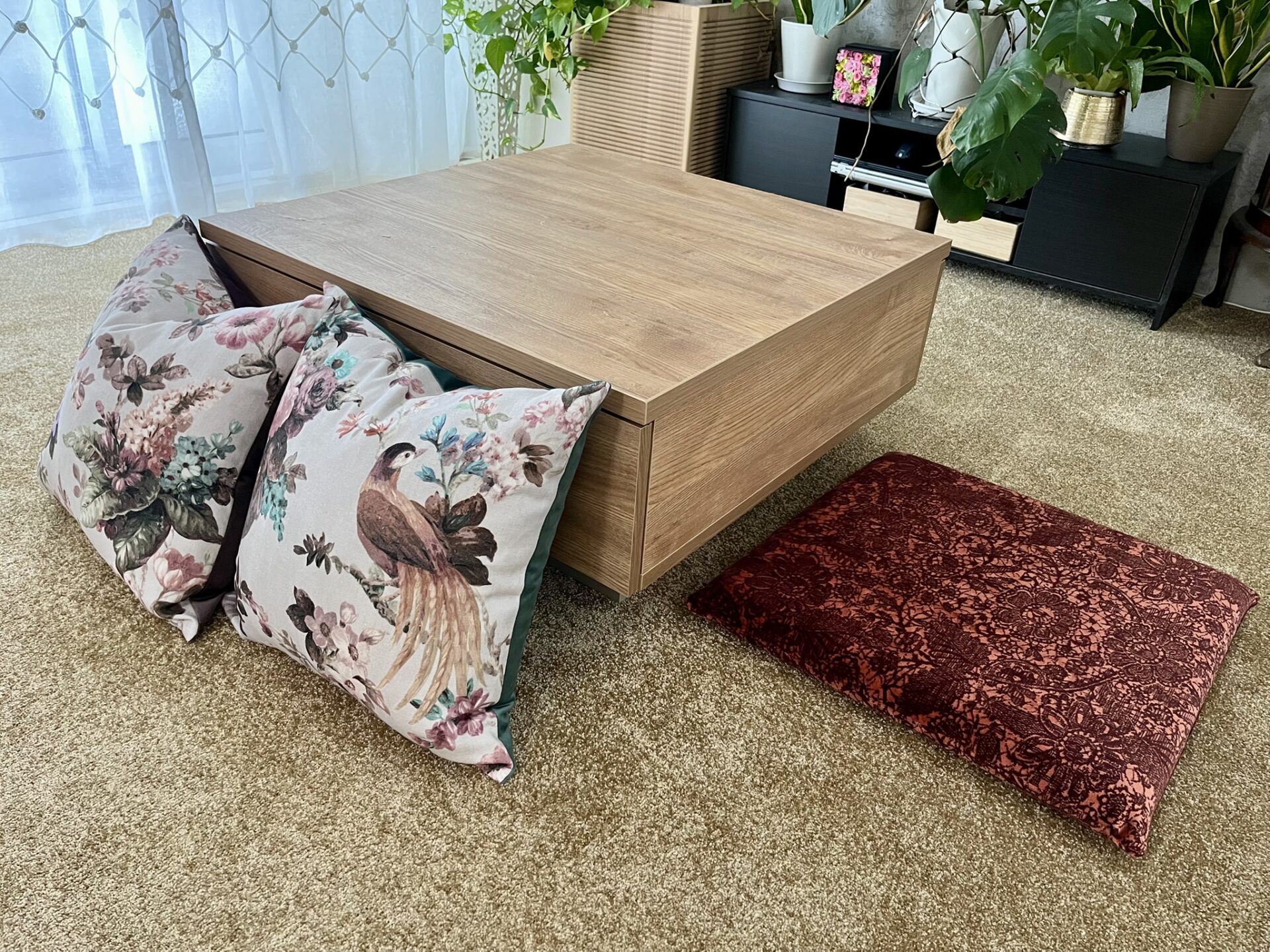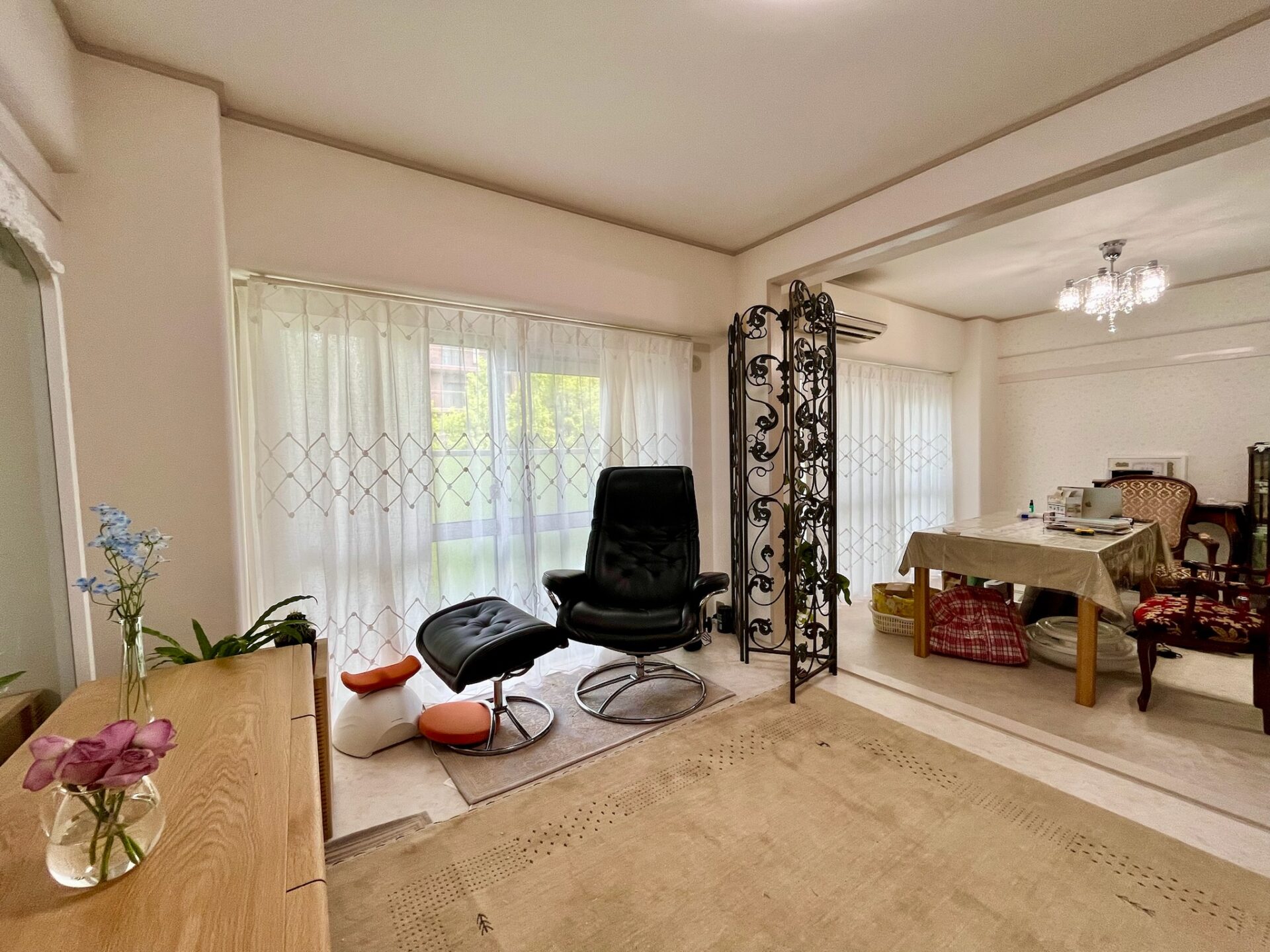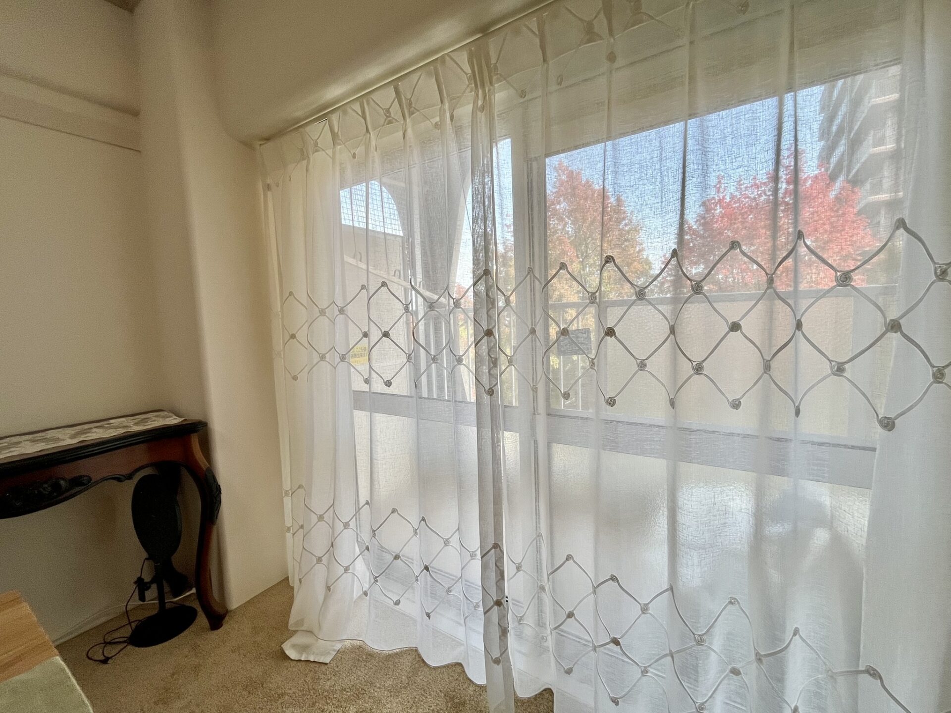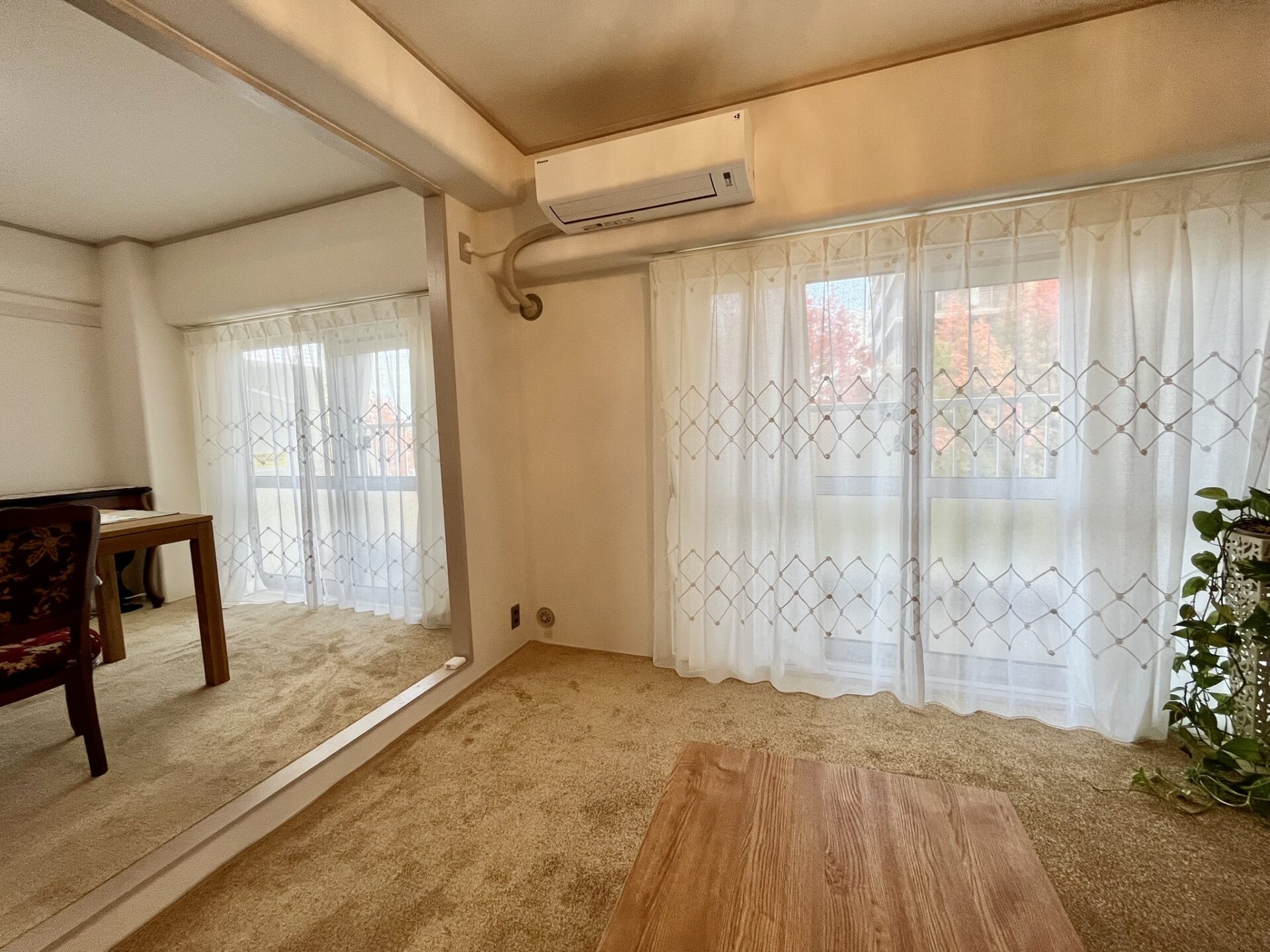 ■施工ポイント:今回の施工では、レースカーテンの掛け替えに加え、壁紙とカーペットの張替えもさせていただきました。もともとのナチュラルで落ち着いた雰囲気を大切にしながら、より心地よく、上品な空間になるようご提案させていただきました。